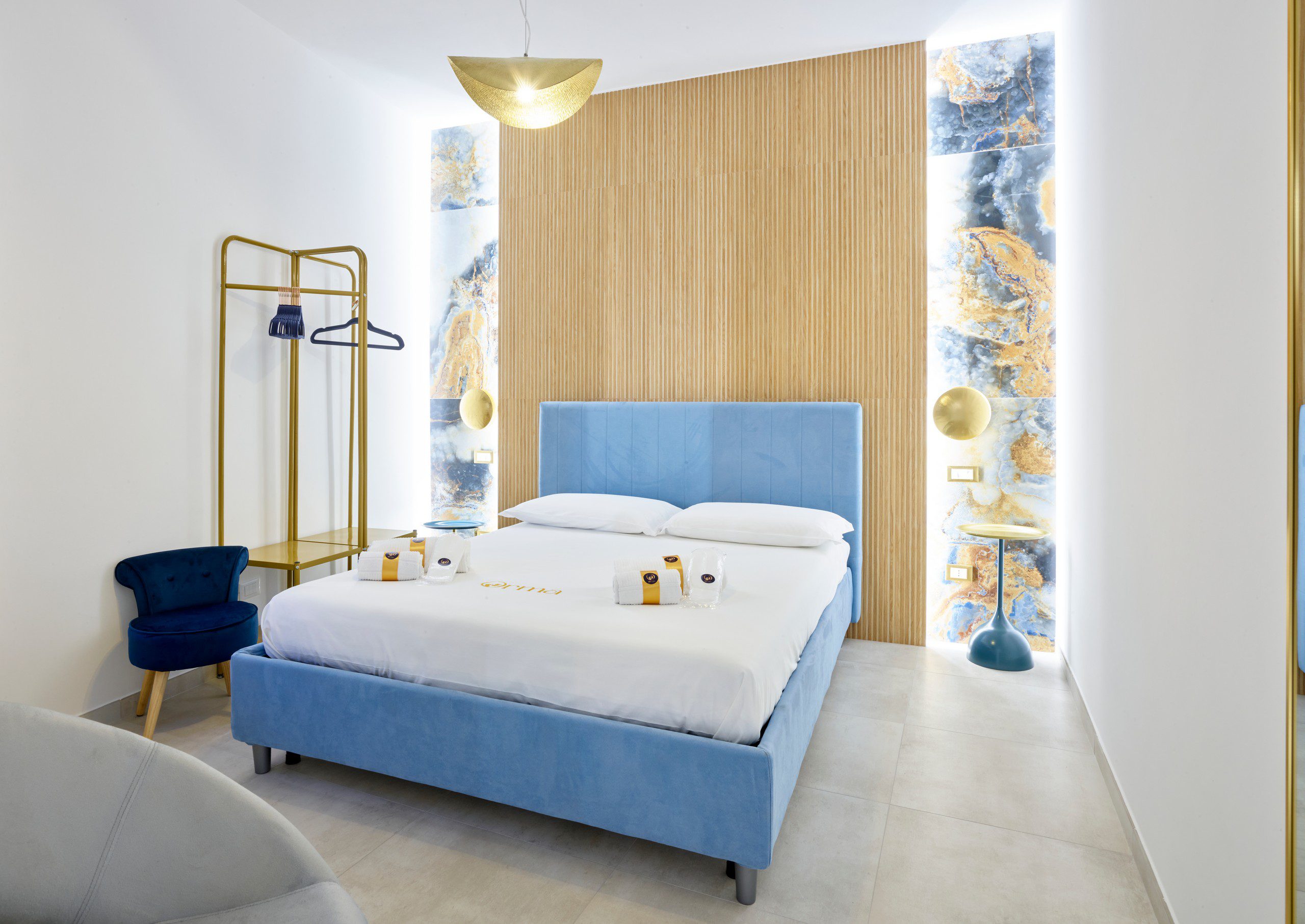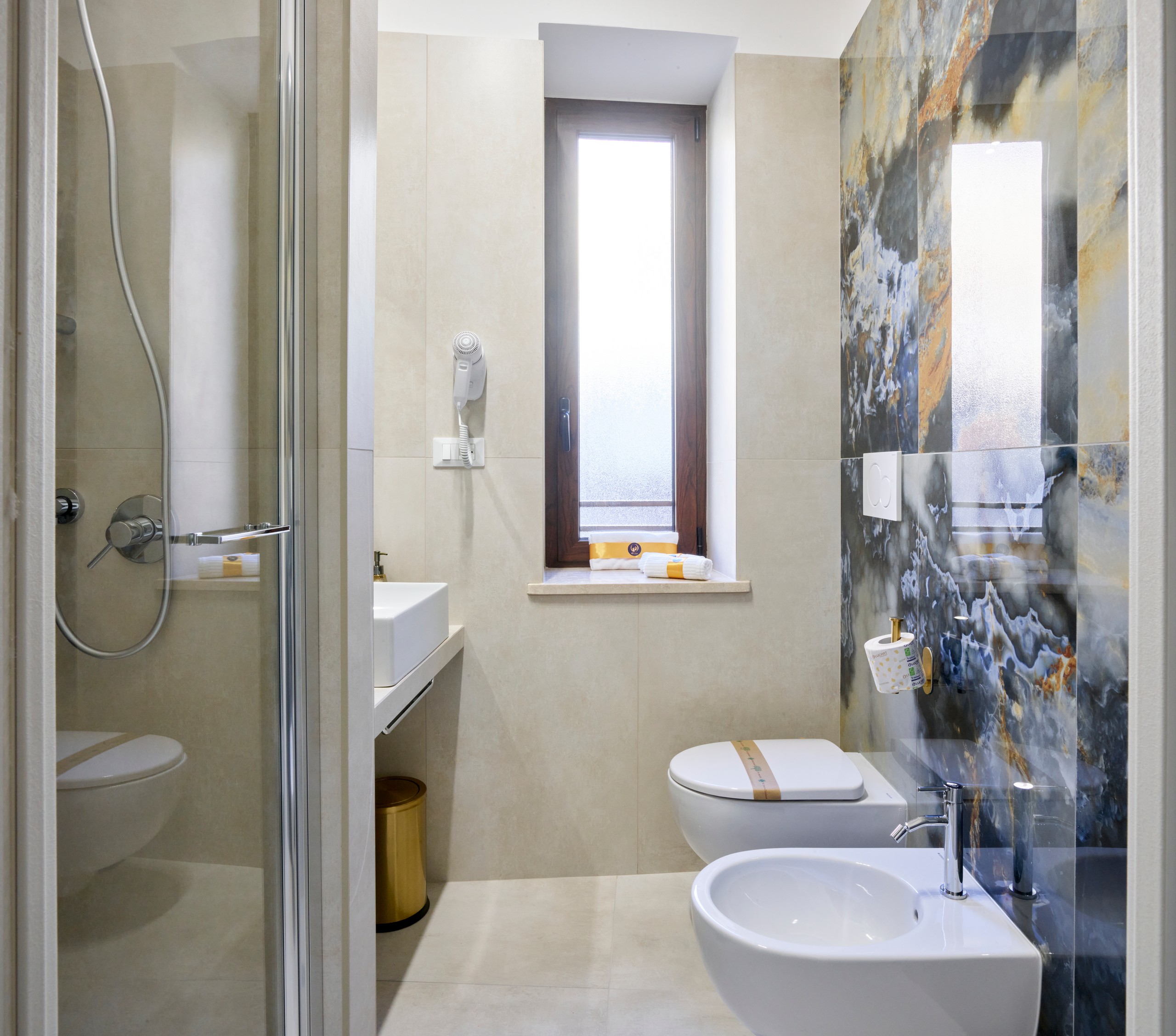 Il bagno in camera è un piccolo gioiello contemporaneo: le grandi piastrelle effetto onice nelle tonalità del blu e dell’oro fanno da cornice alla doccia e ai sanitari sospesi. Lo specchio smart sopra il lavabo illumina il viso con una luce morbida, ideale per prepararsi a una cena nel centro storico di Fondi o per una doccia rigenerante al rientro dal mare. In Blue Room ogni dettaglio è pensato per farti sentire in un ambiente raffinato ma accogliente, dove il design serve una sola missione: farti stare bene.