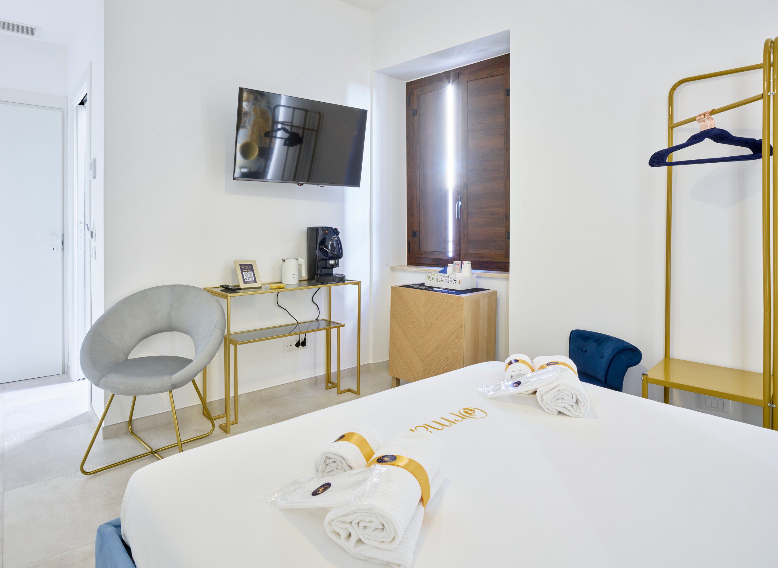 Davanti al letto trovi la zona relax, con poltrona, TV a parete e angolo dedicato alle coccole: la macchinetta del caffè, la tisaniera e il minifrigo ti permettono di organizzarti una colazione lenta in camera o un rientro serale con qualcosa di fresco, senza orari da rispettare. L’aria condizionata autonoma ti segue nei tuoi capricci: un soffio d’aria leggera d’estate, temperatura perfetta in inverno.
